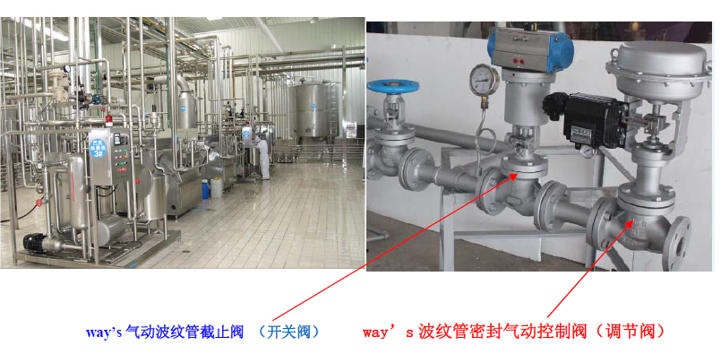 2、因为UHT杀菌工艺是一个非常严苛的、变化的温度过程控制,与食品饮料的品质和口味息息相关,实在是很重要,不允许有任何意外超温的情况出现,所以很多用户还会在气动控制阀前加装一个气动切断阀。这个切断阀以前大多数时候选用的是气动球阀,但是因为球阀是软密封,长期用在高温蒸汽上,密封面很容易老化、磨损变形,导致泄漏,阀门寿命较短,近年大家逐步会选用气动波纹管截止阀替代气动球阀。