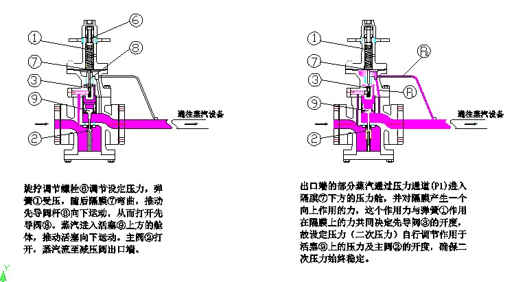 1、直接作用式减压阀:压力调节依赖于上下游压力与弹簧力之间的平衡,阀门开启度是直接由调节弹簧和感应压力的波纹管共同决定。